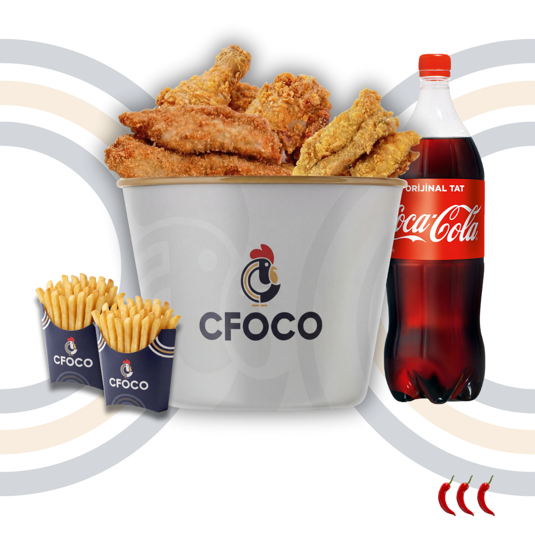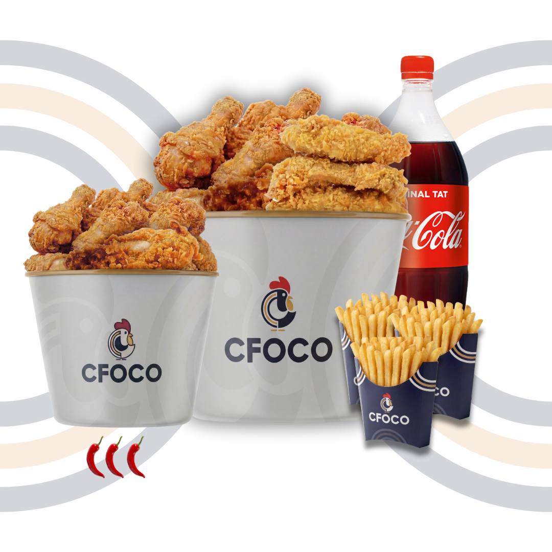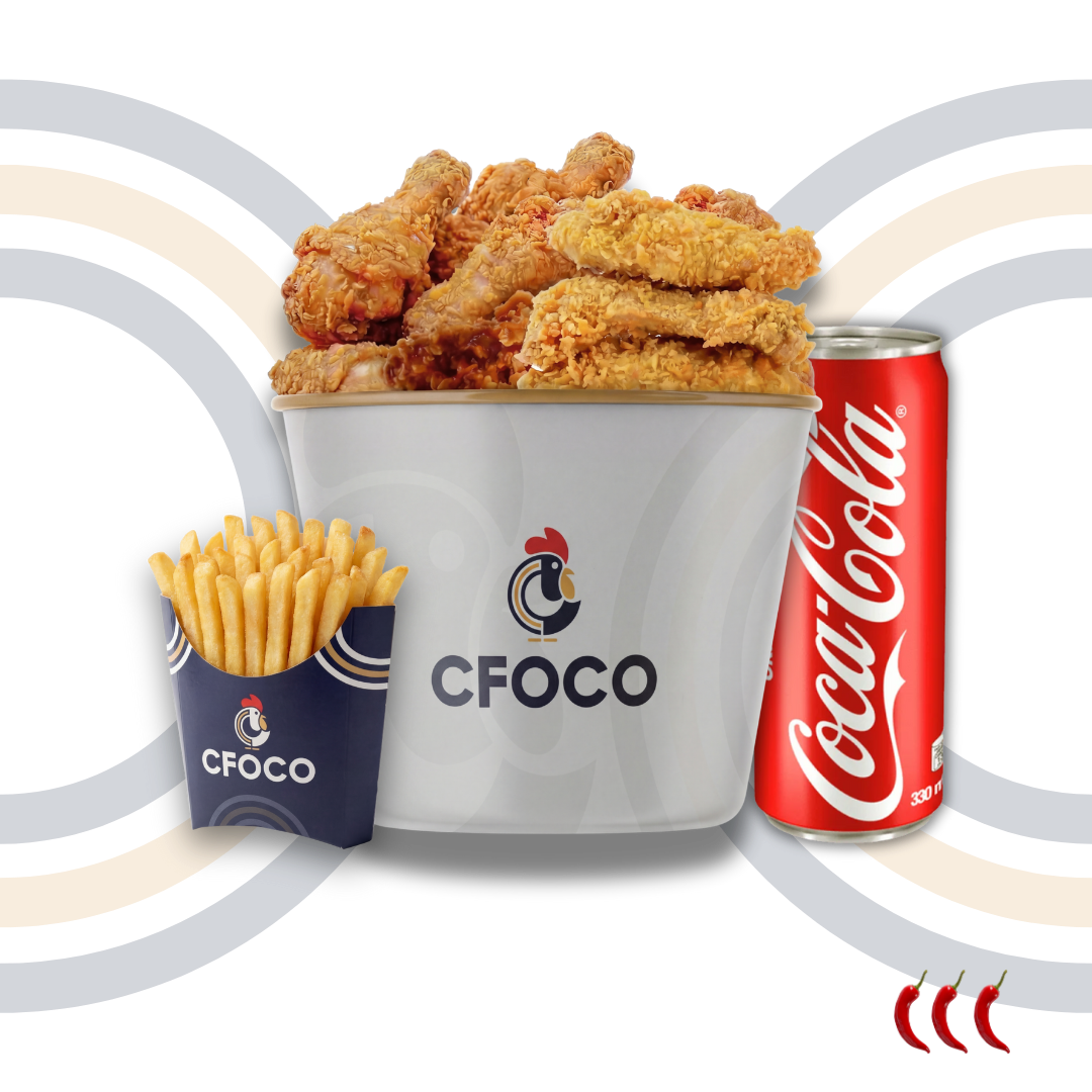 Bucket à composer avec 3 choix parmi 6 viandes, accompagné de 3 frites et d’une bouteille de boisson.
